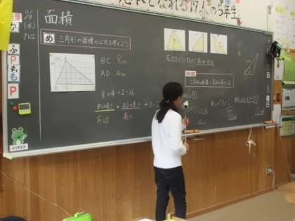 三角形の面積の公式について,それぞれの考えを発表しています。