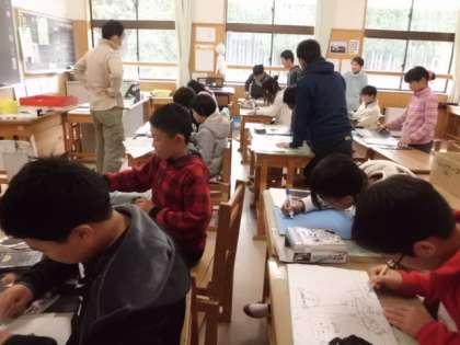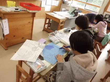 図画工作科で版画に取り組んでいます。下書きを仕上げ,板にその下書きを写していきました。