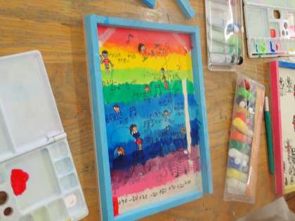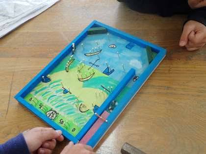 いよいよコリントゲームも完成です。子ども達は自分達が考えたお話をゲームの中に入れて作り上げました。ビー玉の一つ一つの動きに子ども達は喜びの声をあげていました。