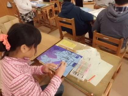 下書きした線をもとに,彫刻刀で板を彫っています。刷るのがとても楽しみになってきました。