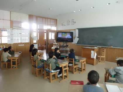 自分たちの演技を見ました。「この台詞,うまく言えた!」「動きがしっかりできた!」など感想を言いながら,楽しく見ていました。