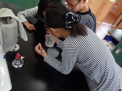 2週間前にした「アルコールランプの使い方」を繰り返し学習しました。前回,うまく火のつけられなかった子もつけられるようになり,喜ぶ姿が見られました。安全にも気をつけ,学習することができました。