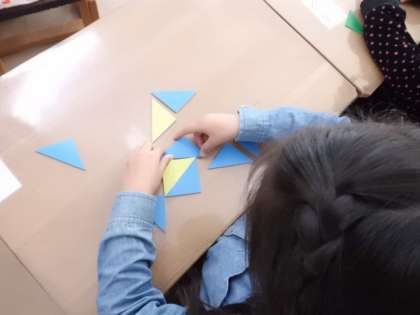 三角形を並べて,形を作ります。どんな組み合わせをすると,見本通りに作ることができるのか…考えています。