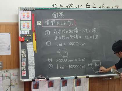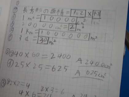 面積の復習をしました。単位、公式、文章問題など子ども達がつまづきやすい問題をみんなで復習しました。