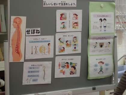 体重計測の時,養護教諭より「背ぼねをのばす大切さ」についてお話を聞きました。体を動かし,座った時や立った時の姿勢も学びました。お話を聞いたことを生かしてほしいと思います。