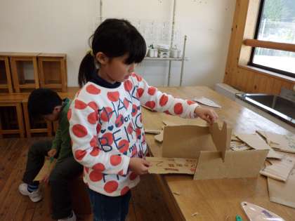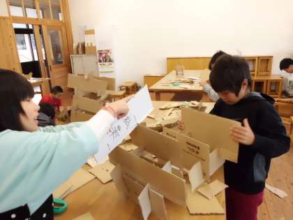 図工の学習では,段ボールを切って組み合わせて作品を作りました。後半は,チームで作品を作りました。