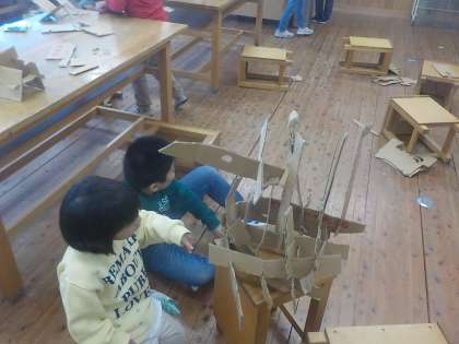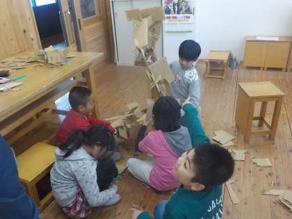図画工作科の時間に造形遊びに取り組みました。段ボールを切る作業はとても楽しく熱中して取り組んでいました。切った段ボールを組み合わせていくと恐竜や家,魚などいろいろなものにみえてきました。