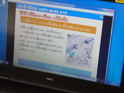 理科では,先週に引き続き「洪水をふせぐ工夫」についてコンピュータで調べました。