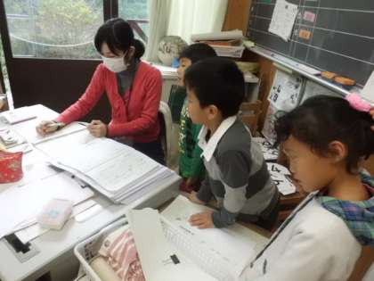 九九をどれだけ覚えられたのか,一人ずつ,先生の前で唱えています。全員,すらすら唱えられるように繰り返し練習していきます。