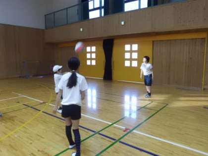 ソフトバレーボールの学習に入りました。チームでの体慣らしから始めます。これからゲームの進め方を学習していきます。