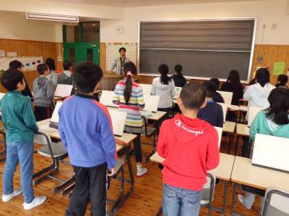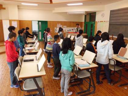 音楽で「茶色のこびん」の合奏をしています。合奏の前に,声だしと合唱をしました。