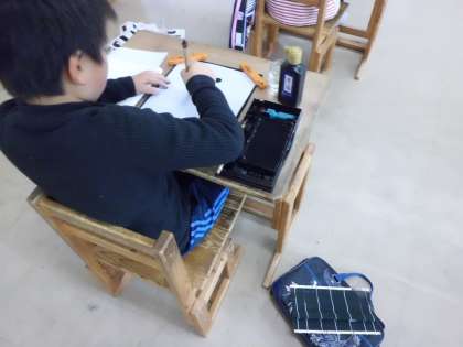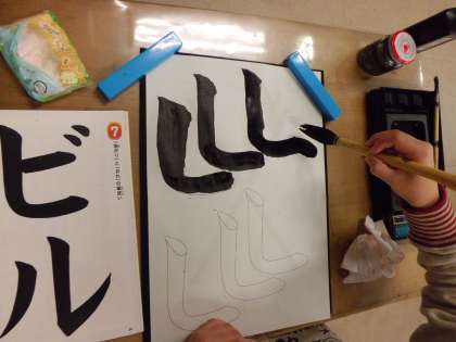 習字で「ビル」という字を書きました。「おれ」「まがり」の筆遣いに気をつけ書きました。部分練習もしました。