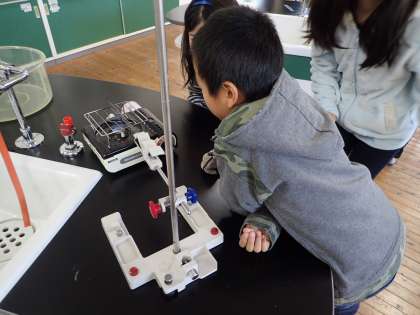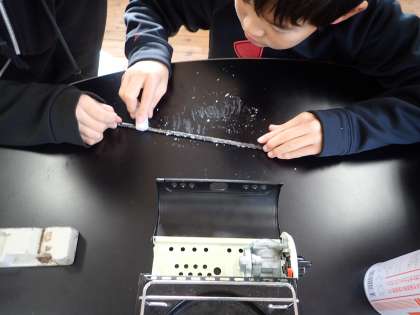 金属のあたたまり方について学習しました。金属棒に「ろう」を塗り,加熱し,どの順番で溶けていくか調べました。とても楽しんで実験していました。