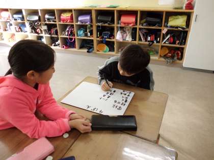 国語の学習で,動き,様子,物・事を表す言葉に分類をしました。班で話し合っていました。