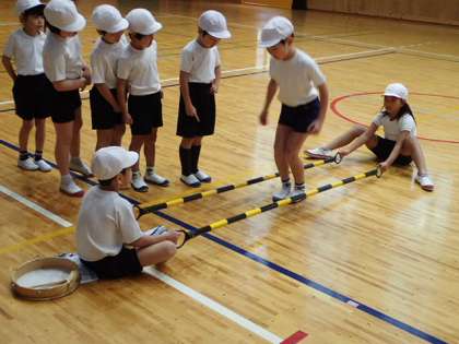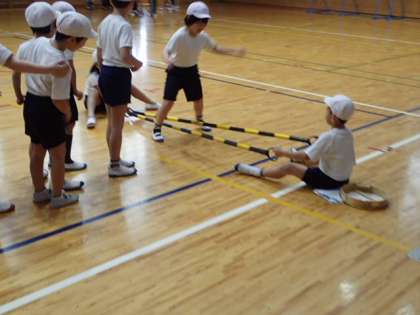 体育で棒を使った遊びにチャレンジしました。棒を跳んだり,バンブーダンスをしたりしました。色々な遊びに挑戦しました。