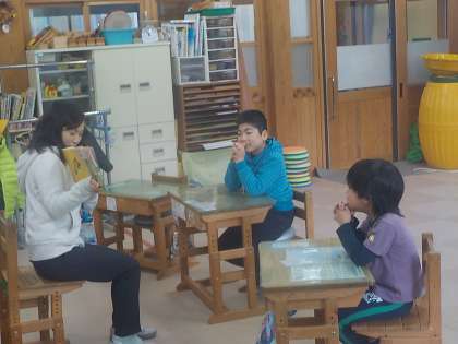 担任以外の教員の読み聞かせを聞きました。絵本の中の野菜畑に何が育てられているのか予想しながら楽しくお話を聞くことができました。