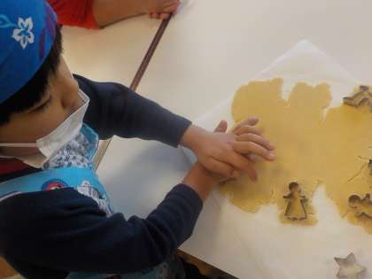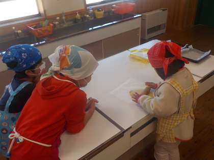 後期前半終了のお楽しみ会をしました。クッキーの生地を伸ばして色々な形で型抜きをしました。「全部でいくつかな」「3人で分けたら何個ずつ食べられるかな」など算数の学習を生かして考えることもできました。
