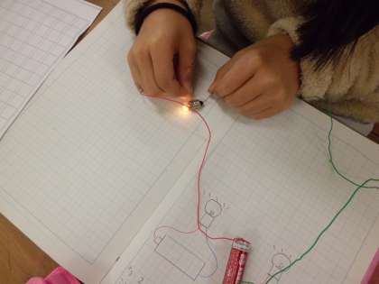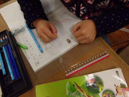次は,「ソケットなし」(豆電球と導線2本と電池)で明かりをつけるつなぎ方を考えました。見つけるのに苦労しましたが,つなぎ方が分かると喜んで明かりをつけていました。