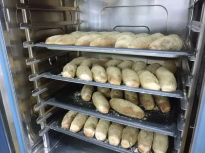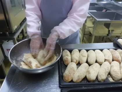コッペパンを揚げ,きな粉をまぶし,スチームコンベクションオーブンで
