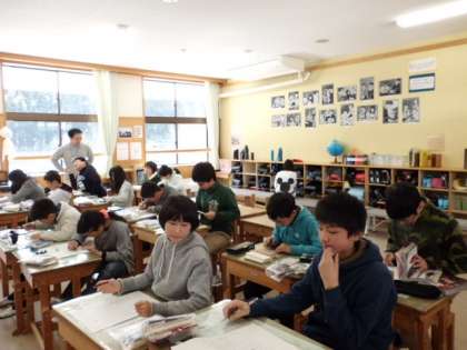 卒業制作で「オルゴール箱」をつくっています。思い出に残った場面を,下書きしました。それをもとに,箱となる木に写していき,これから彫刻刀で彫っていきます。