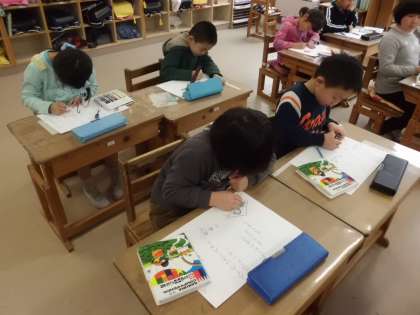 いよいよ仕上げです。作った詩を画用紙に書き,絵も添えて上手に仕上げることができました。