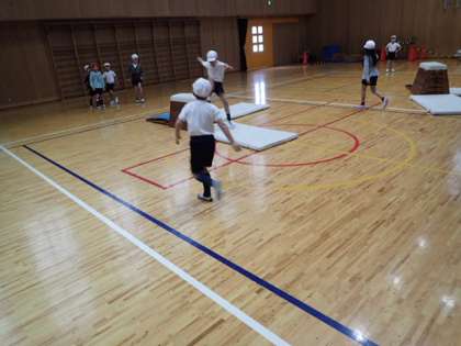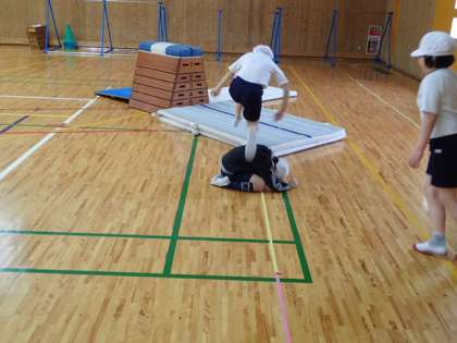 準備がすぐにできたので,たくさん活動をすることができました。跳び箱を使って体ならしをしているところです。