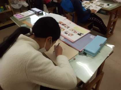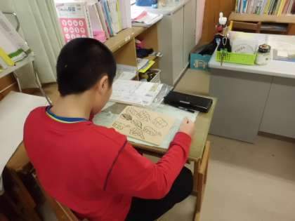 自分たちで考えたパズルを作ります。今日は下絵を描きます。思い思いの絵を丁寧に書いています。