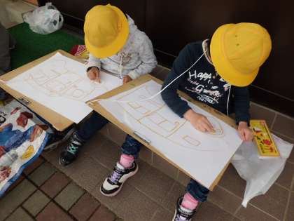 2年生では,消防車や救急車の絵を一緒に描きました。