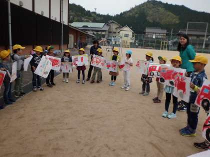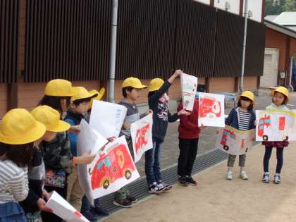 みんなで描いた消防車の絵を,出来たところまで見合いました。