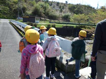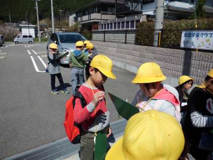社会の学習で,学校の周りの絵地図を作る計画をしています。今日は,みんなで学校の周りをたんけんしました。