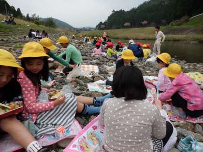 学校付近の河川敷に出て,1年に1回の弁当給食を食べました。みんなでシートを広げ,近くを飛んでいるトンビにも気をつけながら楽しく過ごしました。またひとついい思い出ができました。