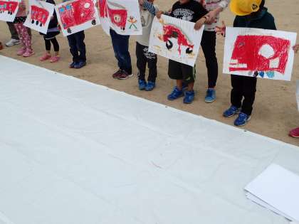 5月1日(月)京北3校の1年生が集まり,消防の絵を描きました。描いた後は,お互いの作品を見せ合ったり,ゲームをしたりして遊びました。楽しんで活動していました。
