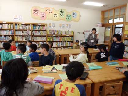 司書の先生から,図書室のひみつについて教えていただきました。図書室にはどのように本が並べられているのかを考え,背ラベルのひみつについて学習しました。