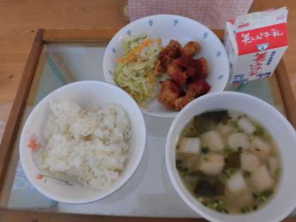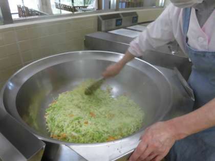 給食室で1つ1つ衣をつけて作るチキンカツは年に一度の献立です。