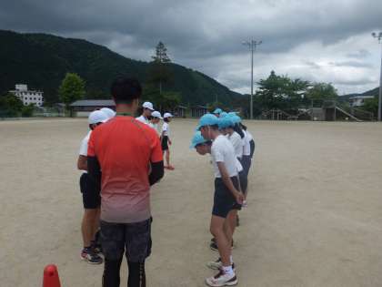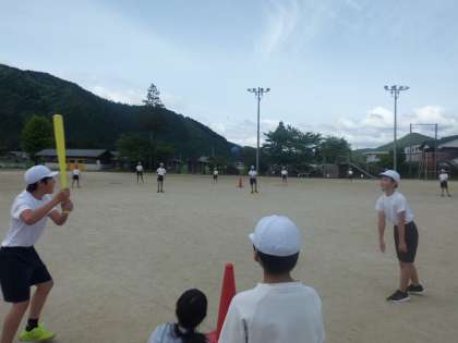 体育でベースボールをしています。通常のルールとは違い,アウトにできる場所をバッターごとに移動させて工夫することで,遠くまで飛んだ打球でもアウトにすることができます。子どもたちも試合を重ねるごとに失点が減り,毎試合白熱しています。