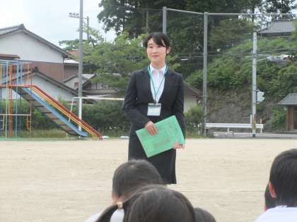 いつもの全校遊びの後、教育実習に来られた先生の紹介がありました。