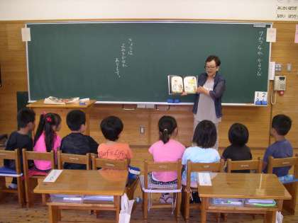 今日は1年生が「京北おはなしの会」の方に読み語りをしていただきました。「おならおばけ」というお話で,おもしろおかしく集中して聞くことが出来ました。