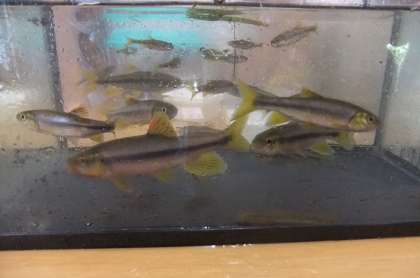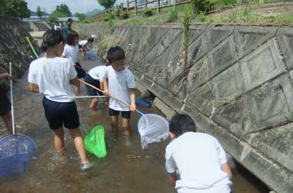 みんなで生き物を探すと魚や水生昆虫などを豊富に捕まえる