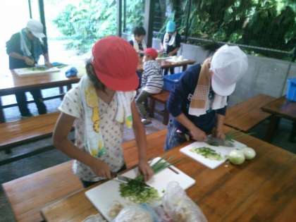 今日の夕食は野外炊事です。すき焼き風煮を作ります。材料を切る係,かまどで火をおこす係に分かれて協力して作業します。互いに声をかけ合ってがんばっています。