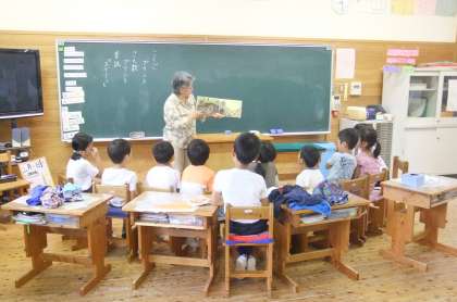 子どもたちが毎月毎月楽しみにしている読み聞かせの時間。今回は「おいてけぼり かっぱちゃん」を読んでいただきました。お話が始まると絵本にくぎ付けになっていました。