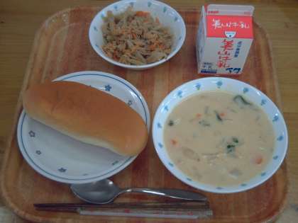今日の献立は,味つけコッペパン・牛乳・かぶらのクリームシチュー・ごぼうのソティでした。かぶらがとてもやわらかく,クリームシチューによくあっていておいしかったです。ごぼうのソティは,ささがきのごぼうと人参を油で炒め,まぐろフレークを加えてしょうゆで味つけをしました。ごぼうの香りと歯ごたえがよく,おいしくいただきました。