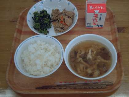 今日の献立は,麦ごはん・牛乳・豚肉とこんにゃくの炒め煮・小松菜のごまいため・ずいきのくずひきでした。豚肉とこんにゃくの炒め煮は,豚肉と人参,しいたけをあま辛くしょうがの風味で炒めました。ずいきのくずひきは,けずりぶしと昆布のだしにシャキシャキと歯ごたえのよいずいきがよくあっていて,おいしかったです。あまり食べ慣れない子どももいましたが,頑張ってたべました。