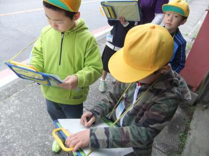 生活科の学習で,学校の近くを探検して,見つけたものを地図に書き込んでいきました。歩いていくとお店や田んぼだけでなく,きれいな花や水路なども発見して地図に書き込んでいく姿が見られました。だんだんとうまっていく地図を見て,「京北の世界地図や!」と言って喜ぶ姿も見られました。