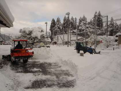 1月17日 昨日からの雪で京北は40〜60センチメートルの雪が学校全体を覆っています。早朝は,学校の除雪機を使って除雪していましたが,登校後地域の方が2台の大型除雪車で取り除いてくださいました。