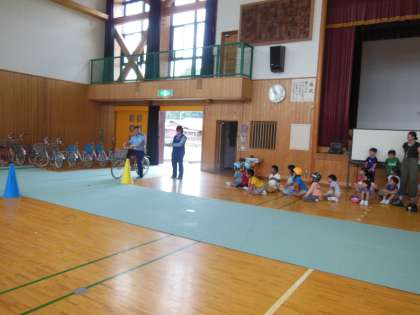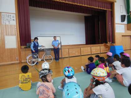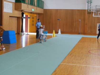 全校自転車教室がありました。夏休みは自転車に乗る機会が増えると思います。怪我なく,安全にすごすことが出来るように自転車の乗り方や交通ルールなどを警察の方に教えていただきました。教えていただいたことを意識しながら自転車に乗ってほしいと思います。