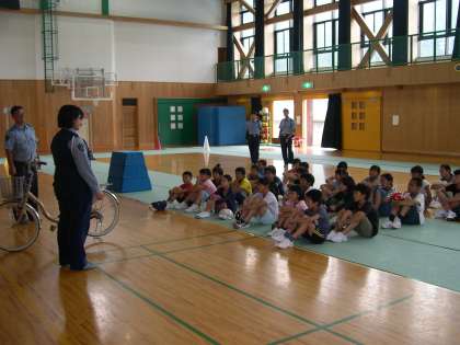 本日右京警察署の方々に来ていただき,全校自転車教室を行いました。最初正しい自転車の乗り方を教えていただき,その後実際に自転車に乗って体育館に作った道路を走りました。