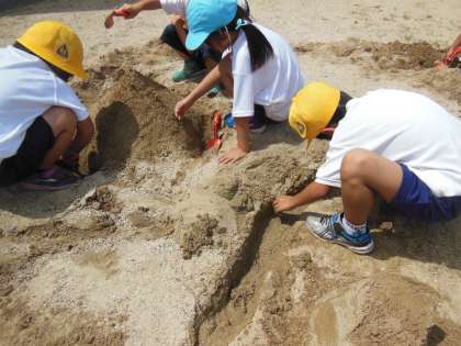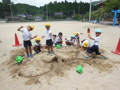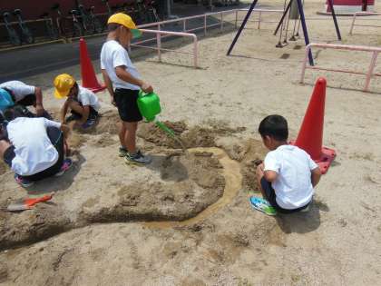 砂場で,すなの感触を楽しみながら山や川,滝などを子どもたちのが思い思いのものをつくりました。みんな楽しくできました。