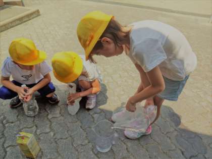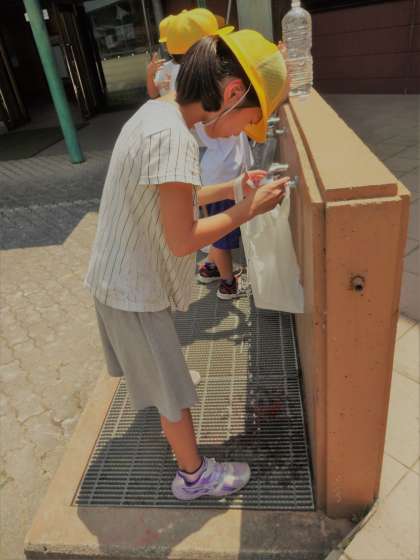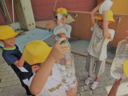 算数科「かさ」で,LやdL,mLを学習しました。今回はいろいろな入れ物に水を入れて,1Lのかさをつくってみました。最初はそれぞれに1Lぐらいの水を入れ物に入れていき,1Lあてゲームをしました。みんななかなか1Lに近い水の量でした。