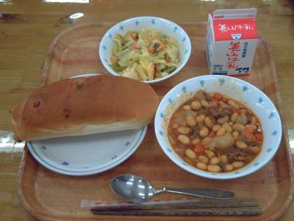 今日の献立は,チーズコッペパン・牛乳・大豆と牛肉のトマト煮・野菜のホットマリネでした。大豆がたくさん入っていましたが,トマト味でおいしく食べられました。野菜のホットマリネは,りんご酢のやさしい味でさっぱりいただきました。