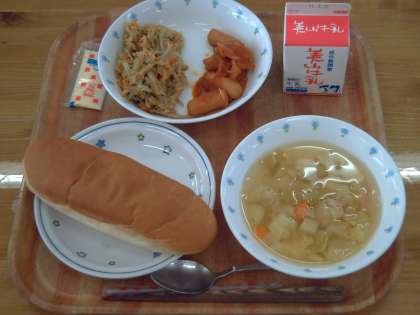 今日の献立は,コッペパン・ツナごぼうサンドの具・ソーセージのトマト煮・野菜のスープ煮でした。パンにツナごぼうのソティやソーセージをはさんで食べました。サンドイッチにして食べて,子ども達はうれしそうでした。ツナごぼうのソティは,カレー味で,ごぼうをたっぷり食べられました。